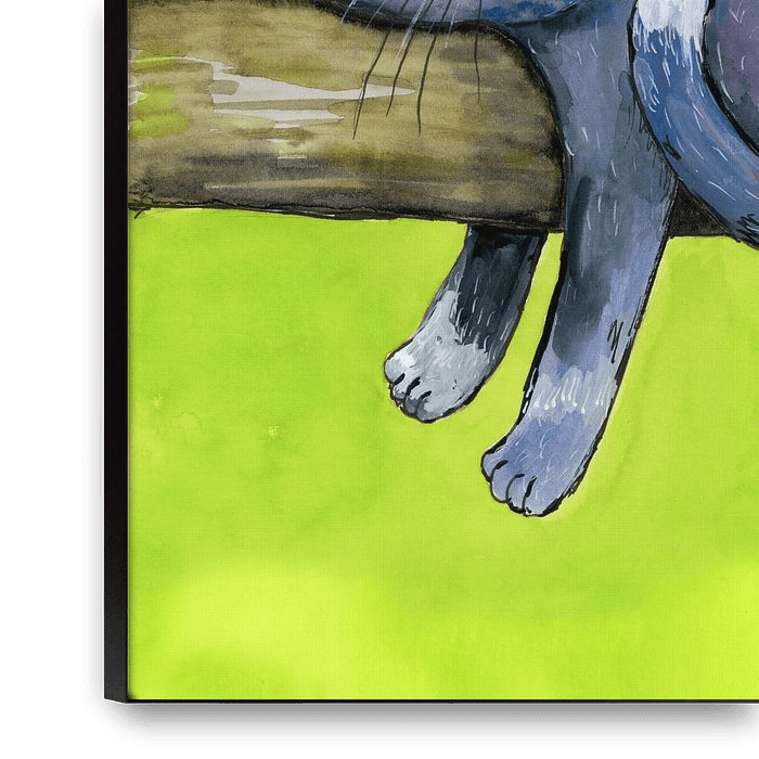 Ein Gemälde in Acryltinte von einer Katze, die schlafend liegt. Er schläft auf einem Baumstamm und seine Pfoten baumeln herunter. Er sieht sehr glücklich aus. Sein Schwanz mit weißer Spitze rollt sich gemütlich ein.