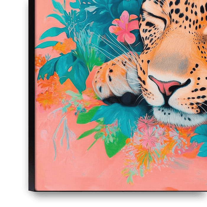 Inmitten leuchtender Blumen und blühender Farben ruht ein majestätischer Leopard. Seine sanften, gepunkteten Fellmuster harmonieren perfekt mit dem lebhaften Hintergrund, während die Augen geschlossen sind und der Frieden des Augenblicks spürbar wird. Die Kombination aus kraftvoller Eleganz und weicher Flora schafft eine traumhafte,…
