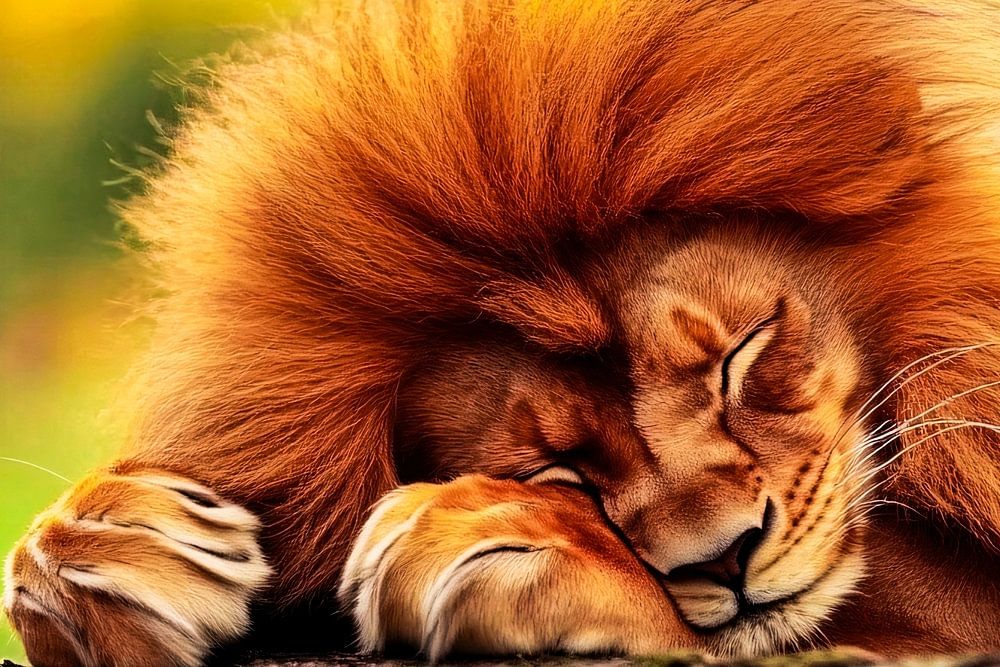Dieses wunderschöne Design zeigt einen majestätischen Löwen, der friedlich auf einem Baumstamm schläft, umgeben von warmen Herbstfarben. Die üppige Mähne des Löwen strahlt Kraft und Gelassenheit aus, während das sanfte Licht des Hintergrunds eine verträumte Atmosphäre schafft. Dieses Motiv ist perfekt für Natur- und Tierliebhaber und bringt ein Gefühl von Ruhe und Wärme in jeden Raum. Eine ideale Wanddekoration für ein Schlafzimmer, Esszimmer oder Büro, um einen einzigartigen und stilvollen Look zu verleihen.