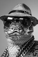 Monochromes Bild einer Python mit Hut und Sonnenbrille, die Stil und Individualität ausstrahlt. Ästhetik und Textur im Detail.