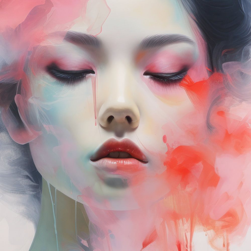 Veil of Dreams" ist ein faszinierendes Kunstwerk, das die ätherische Natur der Träume und die Vergänglichkeit der Schönheit verkörpert. Das weibliche Porträt mit geschlossenen Augen und sanftem Ausdruck scheint in einem Dunst aus rosa und weißem Rauch zu versinken, der die geheimnisvolle Welt der Träume symbolisiert. Die Farbtropfen, die von der Leinwand abzutröpfeln scheinen, verleihen dem Werk eine rohe, ungeschliffene Dimension und schaffen einen interessanten Kontrast zwischen der raffinierten Schönheit des Motivs und dem wuchernden Chaos der Umgebung. Dieses Werk wäre eine heitere und zugleich provokante Ergänzung für jeden Raum, ideal für eine Umgebung, die sowohl Ruhe als auch künstlerische Tiefe schätzt.