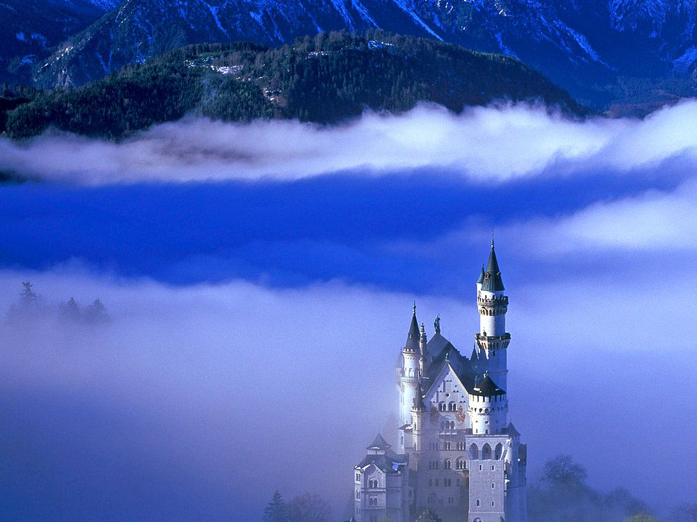 Schloß Neuschwanstein über dem Nebel mit den Tannheimer Alpen im Hintergrund, Allgäu, Bayern, Deutschland