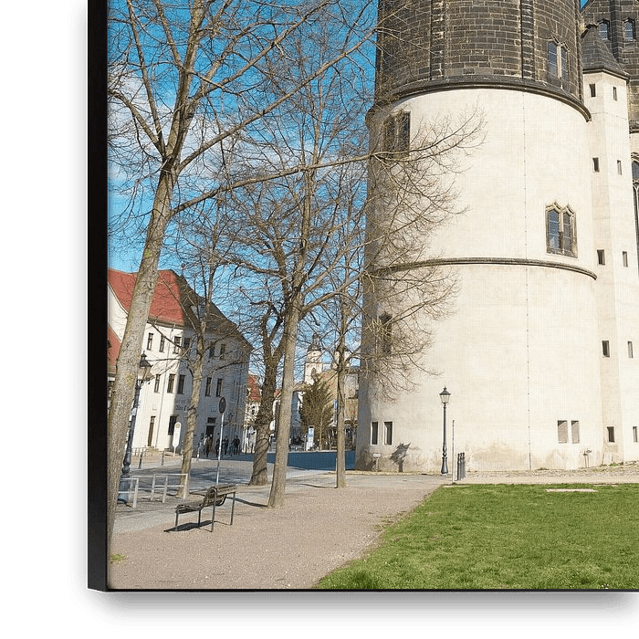 Bestelle das Foto Schlosskirche in der Altstadt von Wittenberg von Heiko Kueverling als Reproduktion auf Leinwand, Alu-Dibond, als Poster, Fototapete oder Acrylglasbild.