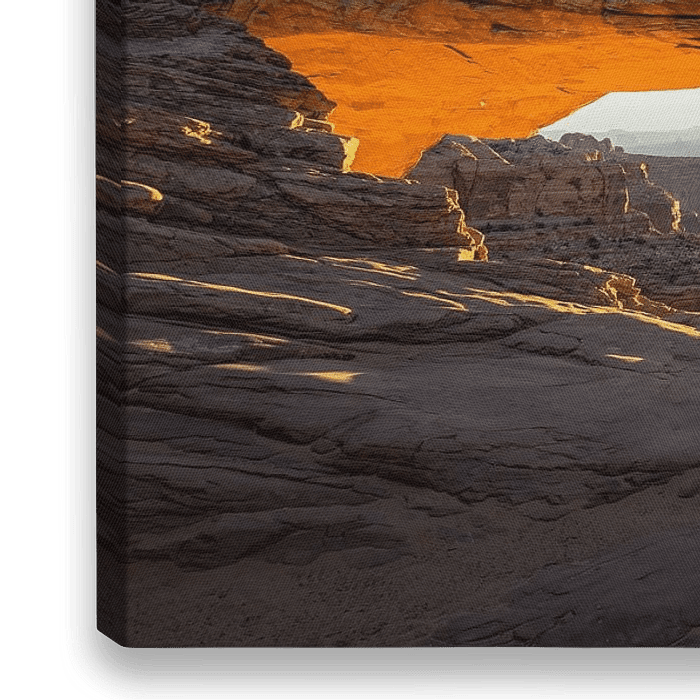 Ein Bogen, der eine Reihe von natürlichen Säulen im American Canyon überragt, landet im orangenen Glanz der aufgehenden Sonne.