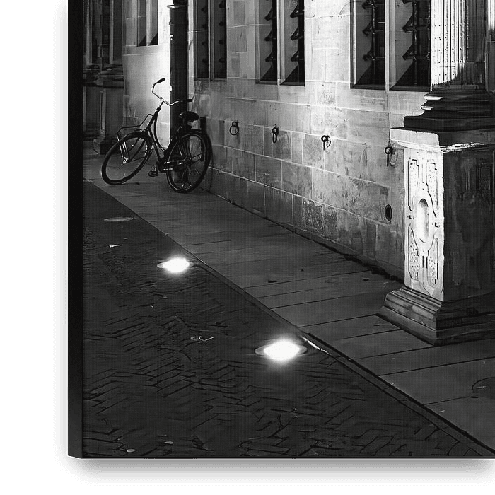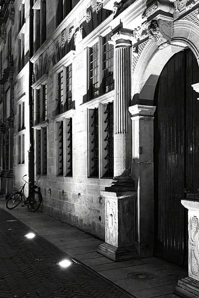 Lead Key City mit Rathaus. Diese abendliche Schwarz-Weiß-Aufnahme zeigt die in sanftes Licht getauchte Fassade des Rathauses von Leiden. Die historische Architektur strahlt Ruhe und Zeitlosigkeit aus. Vor der Fassade steht ein Damenfahrrad, ein scheinbar kleines Detail, das den Charakter der Stadt treffend zusammenfasst.