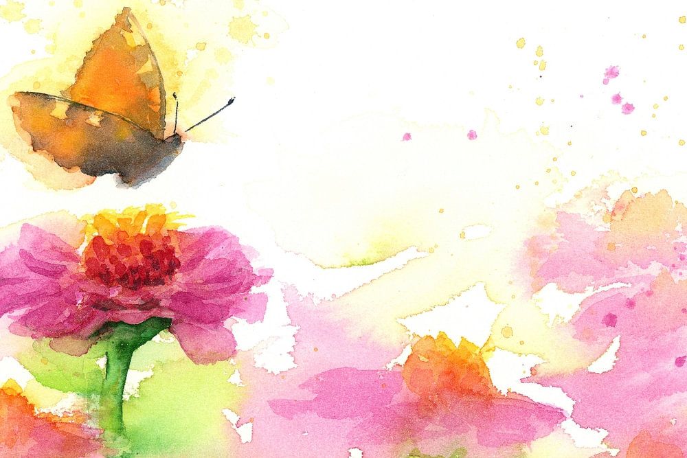 Schmetterling und pinkfarbene Zinnien ist ein Aquarellgemälde im Querformat gemalt von der Künstlerin Karen Kaspar. In einem Sommergarten blühen Zinnien in leuchtendem Pink. Während die Blüten und die grünen Blätter überwiegend abstrahiert dargestellt sind, ist eine Zinnienblüte realistischer ausgearbeitet. Dieser Blüte nähert sich ein orangefarbener Schmetterling. Das Bild ist in einem lockeren frischen Stil gemalt.