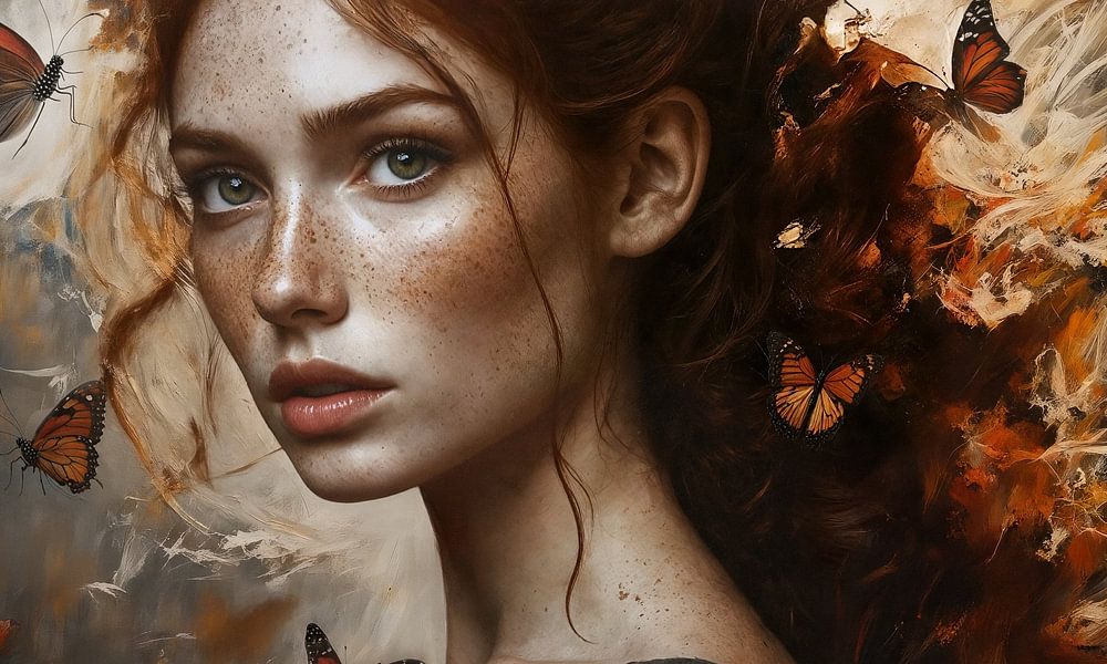 Eine elfenhafte, sommersprossige junge Frau mit strahlend rotem Haar wird von einer Schar bunter Schmetterlinge umgeben. Ihr hübsches Gesicht, das mit kräftigen Pinselstrichen umrandet ist, versprüht einen traumhaften Glanz und eine magische Ausstrahlung