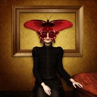 Surreales Portrait einer Frau, die an einem Tisch sitzt. Im Hintergrund ist eine Wand mit einem leeren Rahmen. Ihr Gesicht wird maskiert von einem roten Schmetterling. Ist er Teil der Frau? Oder sollte er eigentlich im Bilderrahmen sein. Entscheiden Sie selbst.