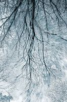 Schneebedeckte Baumzweige, von unten fotografiert.