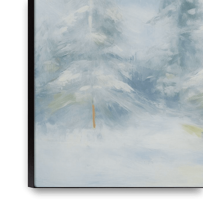 Verschneite Landschaft mit Bergen und einem Kiefernwald. Die Pastellfarben und der geringe Kontrast sorgen für einen ruhigen Look. Holen Sie sich die weihnachtliche Gemütlichkeit mit diesem bezaubernden Stück in Ihr Zuhause!