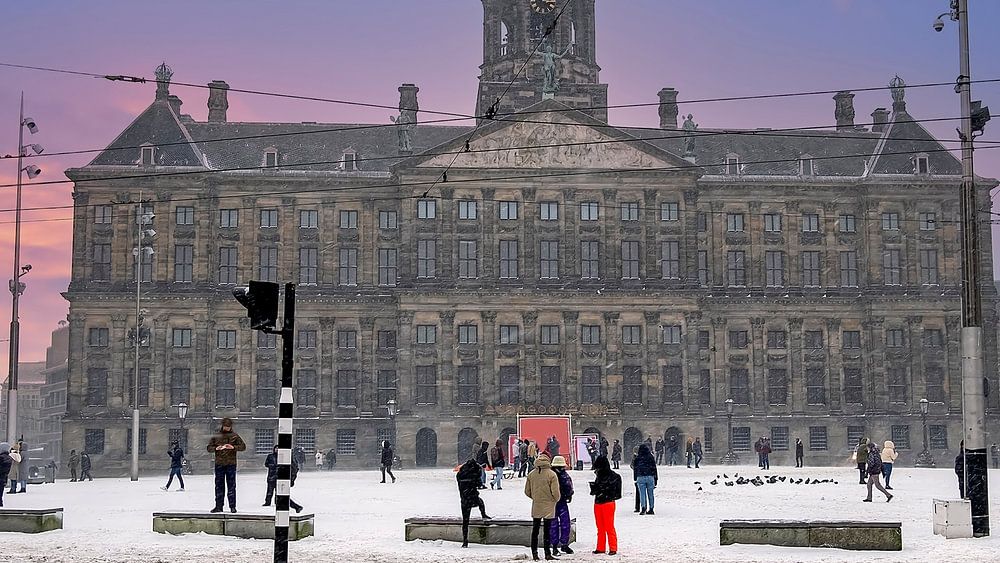 Schneebedecktes Amsterdam am Dam-Platz in den Niederlanden im Winter bei Sonnenuntergang