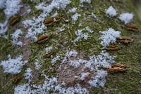 Schneeflocken auf Baumstamm - Es hatte gerade zu schneien begonnen und die Schneeflocken landeten auf dem Baumstamm, als ich diese Makroaufnahme machte. Das helle Weiß kontrastiert mit dem Olivgrün und dem warmen Braun des Baumes.