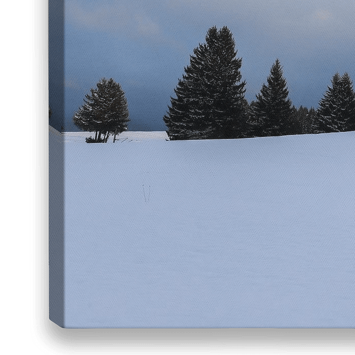Sanfte Hügel mit Schnee bedeckt, Bäume und ein imposanter Wolkenhimmel. Ds Bild habe ich in der Nähe von Krün aufgenommen an einem schönen Wintertag im Februar.