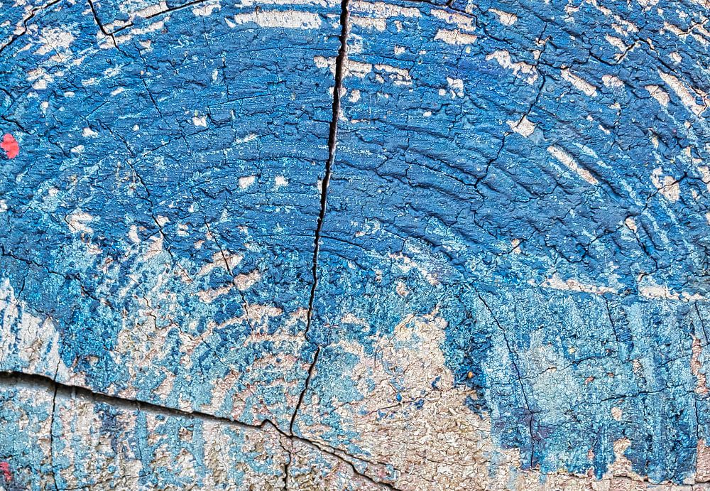 Baumstamm mit blauer Farbe und einem roten Punkt durchgeschnitten.