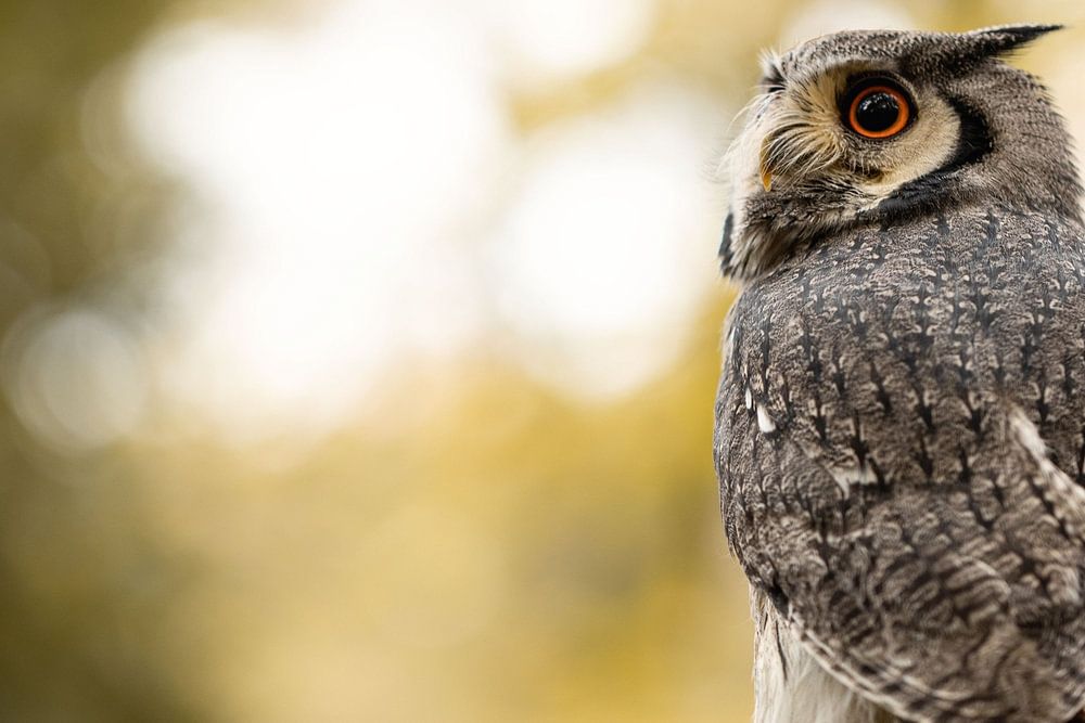 Foto eines wunderschönen Zwergkauzes, einer Weißwangeneule, in einer herbstlichen Waldumgebung. Der Vorder- und Hintergrund des Fotos sind schön weich und unscharf. Damit die Eule im Mittelpunkt steht. Die Eule schaut zurück in die Kamera.