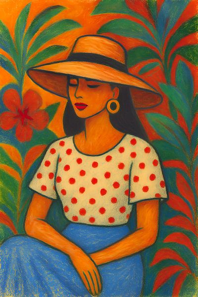 Bestelle dieses moderne Wandbild Schöne Frau mit Hut Gemälde. von Johannes als Reproduktion auf Leinwand, Alu-Dibond, als Poster, Fototapete oder Acrylglasbild.