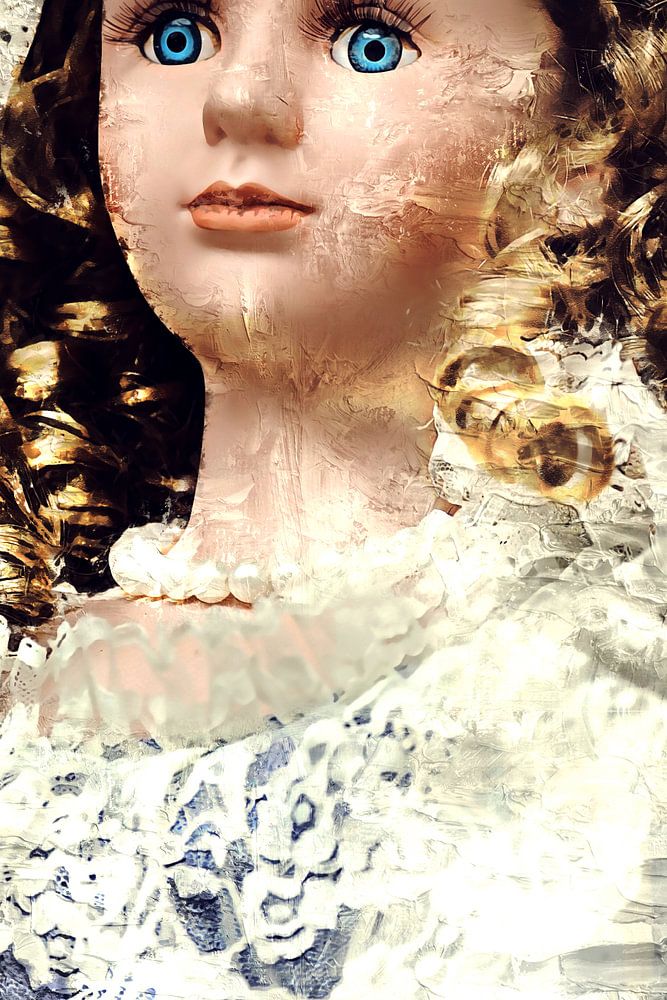 Ich bin kürzlich durch Vlissingen (Zeeland) gelaufen und habe in einem Schaufenster eine Reihe von alten antiken Puppen gesehen. Ich machte einige Fotos davon, und danach waren sie eine Inspiration für mich, eine Serie davon zu machen. Neben den Fotos habe ich nun auch ein paar Mixed Media Kunstwerke gemacht.