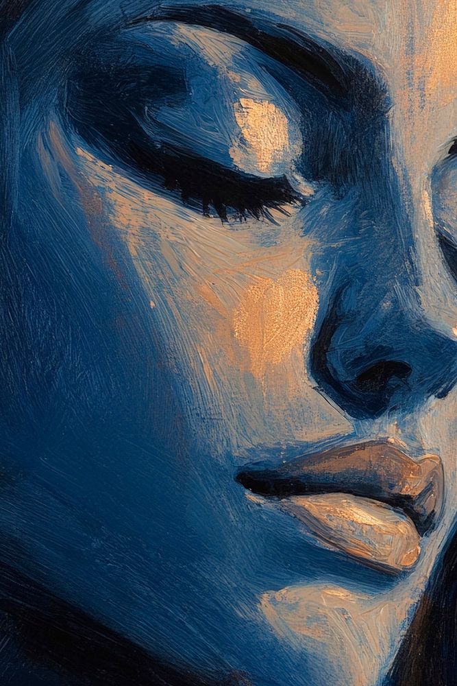 Ein harmonisches Spiel aus tiefen Blautönen und sanften Lichtreflexen entfaltet eine Atmosphäre der Ruhe und Introspektion. Die sanften Gesichtszüge und das geschlossene Auge vermitteln ein Gefühl der Gelassenheit und träumerischen Eleganz. Ideal für das Schlafzimmer, wo es einen Rückzugsort für Entspannung und Selbstbesinnung schafft.