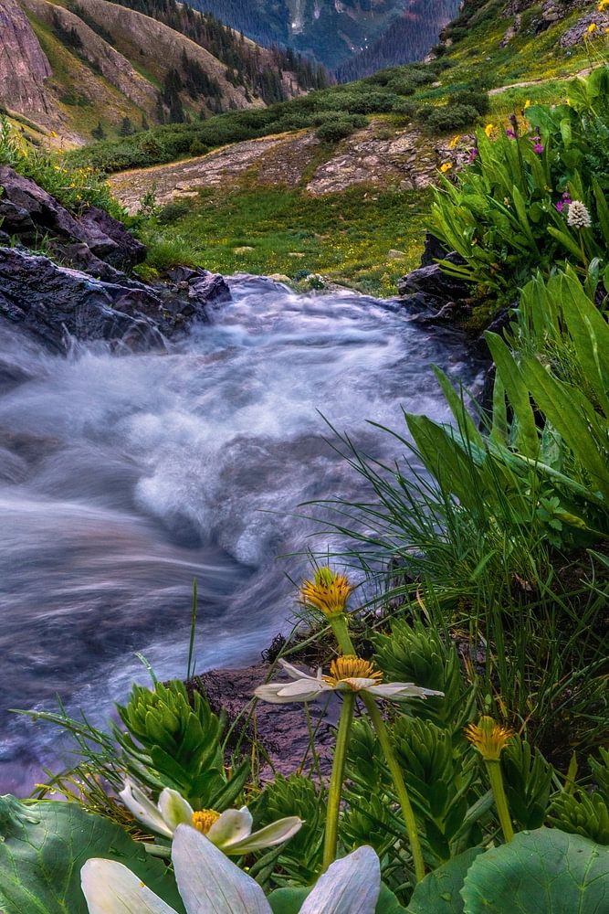 Fine Art Foto eines malerischen Sonnenuntergangs hoch in den Bergen über Silverton, Colorado. Ich habe diese schöne Szene auf einem Sommercampingausflug aufgenommen. Ich schlug mein Lager direkt über dieser Szene auf und machte Abendessen. Als ich mit dem Abendessen fertig war, zog am Horizont ein entferntes Gewitter auf. Ein paar Minuten später begann der Sturm, die Farben des Sonnenuntergangs aufzunehmen. Ich packte schnell meine Ausrüstung zusammen und machte mich auf die Suche nach einem schönen Vordergrund. Ich kletterte einige Felsen hinunter und fand diese schöne weiße Sumpfdotterblume und den Bach, der auf den Berg zufließt. Das war die Aufnahme der Nacht!