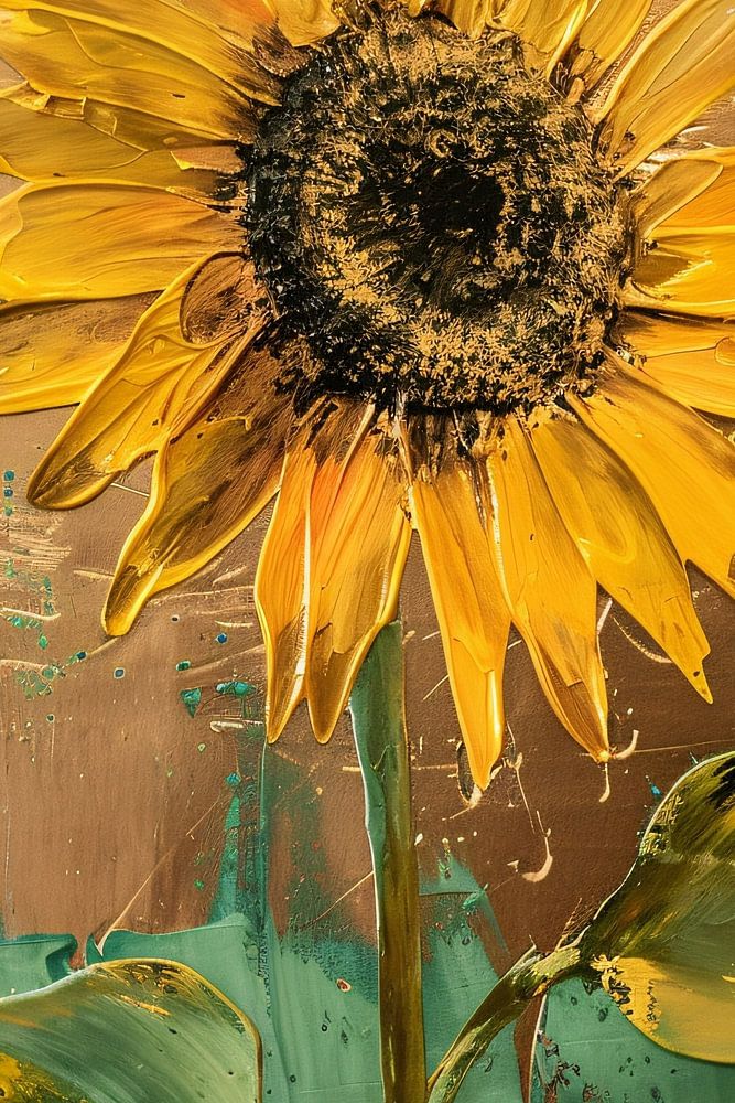 Dieses wunderschöne Kunstwerk zeigt eine Sonnenblume in ihrer ganzen Pracht, mit satten, lebendigen Farben, die sich von einem Hintergrund aus goldenen und grünen Tönen abheben. Das Design strahlt eine moderne Ästhetik aus, die vom Jugendstil inspiriert ist, und bringt ein Gefühl von Wärme und natürlicher Schönheit in jeden Raum. Dieses Gemälde eignet sich perfekt für das Wohnzimmer oder das Büro und bringt einen Hauch von Eleganz und Farbe in Ihr Interieur. Die detaillierten Pinselstriche und das Spiel von Licht und Schatten verleihen der Sonnenblume ein fast dreidimensionales Aussehen, so dass es scheint, als ob die Blume aus der Leinwand springt. Ein ideales Geschenk für Kunstliebhaber und eine hervorragende Ergänzung für jede Kunstsammlung.