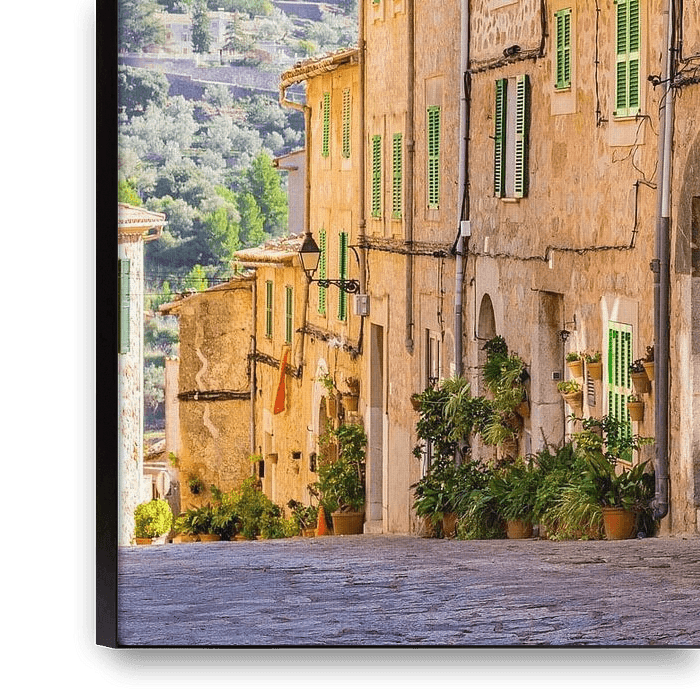Bestelle dieses Blumen-Wandbild Schöne Straße in dem mediterranen Dorf Valldemossa auf Mallorca Spanien von Alex Winter als Reproduktion auf Leinwand, Alu-Dibond, als Poster, Fototapete oder Acrylglasbild.
