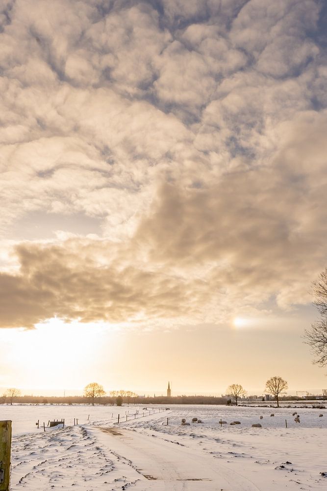 Schönes Foto von einer schneebedeckten Wiese kurz nach Sonnenaufgang. Das holländische Licht verleiht dem Foto einen schönen goldenen Schimmer. Die Reifenspuren im Schnee ziehen Sie direkt ins Bild. Die Masten und der Zaun im Vordergrund geben dem Foto viel Tiefe. Die Schäfchenwolken und der blaue Himmel geben dem Foto zusammen mit dem gelb-goldenen Schimmer eine schöne Pastellfarbe.