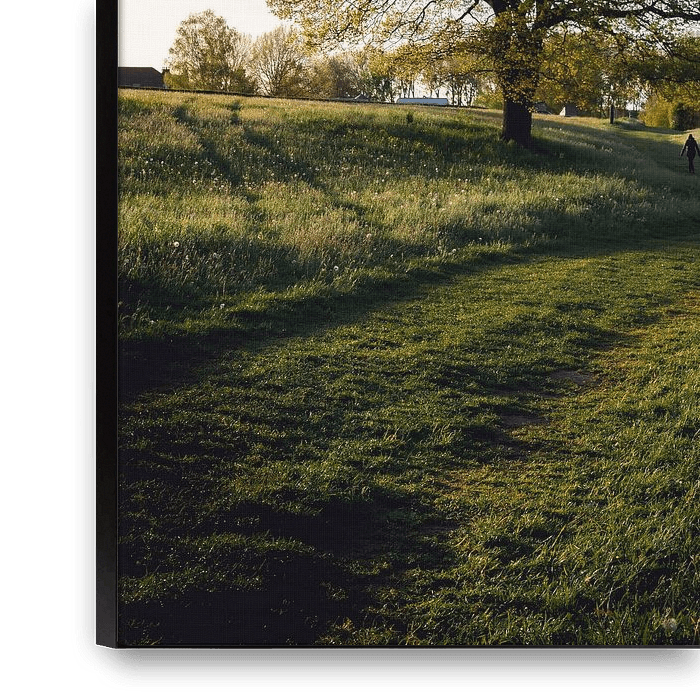 Ein Paar geht an einem schönen Baum in den Limburger Hügeln vorbei, während die Abendsonne auf sie scheint. Werden Sie diesen schönen Fotodruck an Ihre Wand hängen?