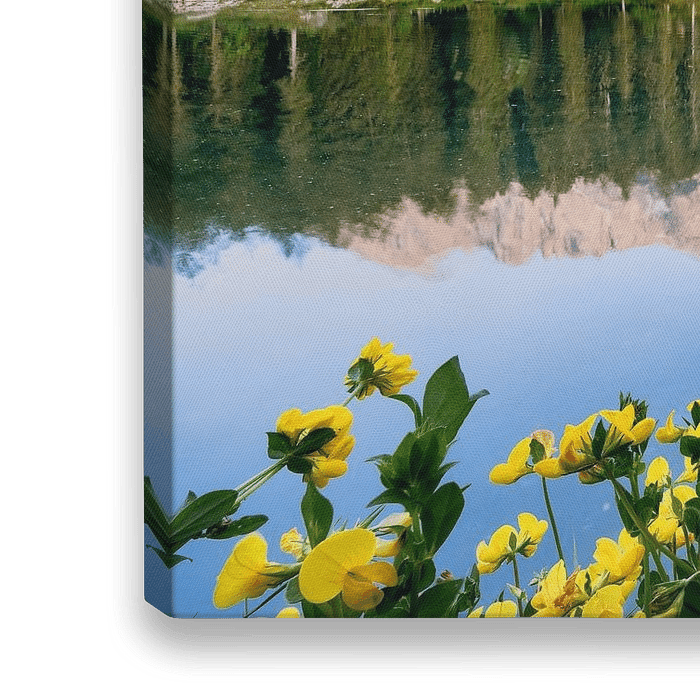 Bestelle dieses Landschafts-Wandbild Schöner Bergsee in den Dolomiten mit blühenden Alpenblumen von Voss Fine Art Fotografie als Reproduktion auf Leinwand, Alu-Dibond, als Poster, Fototapete oder Acrylglasbild.