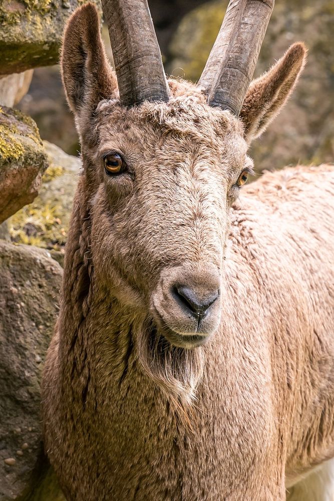 Eine scharfe Nahaufnahme eines schönen hellbraunen männlichen Alpensteinbocks. Der Steinbock hat große Hörner mit Ringen an der Vorderseite und einen langen Ziegenbart. Das Geweih ist anmutig nach hinten gebogen. Der Steinbock blickt direkt in die Kamera, so dass man das Gefühl hat, dass er einen mit seinen hellen Augen direkt anschaut. Das Foto wurde durch eine Aussichtsplattform aufgenommen, wodurch der Vordergrund schön unscharf ist. Im Hintergrund sind Felsen mit Moos zu sehen.