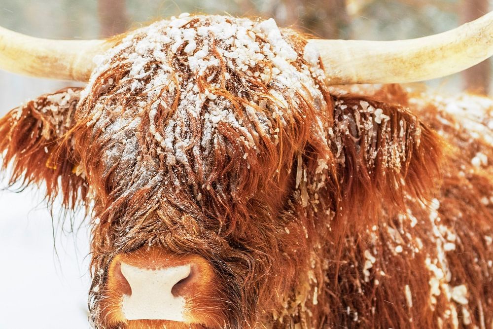 Porträt eines schottischen Hochlandrindes im Schnee während des Winters. Die schottischen Hochlandrinder werden beim Naturschutz in der Veluwe eingesetzt, um sicherzustellen, dass die Heideflächen nicht zu dicht wachsen.