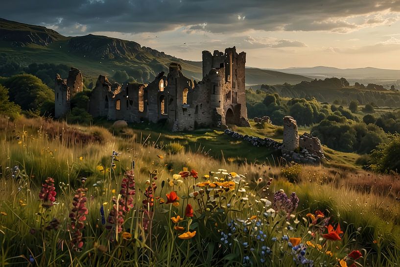 Bestelle dieses Landschafts-Wandbild Schottische Highlands mit Wildblumen und Ruine. von Brian Morgan als Reproduktion auf Leinwand, Alu-Dibond, als Poster, Fototapete oder Acrylglasbild.