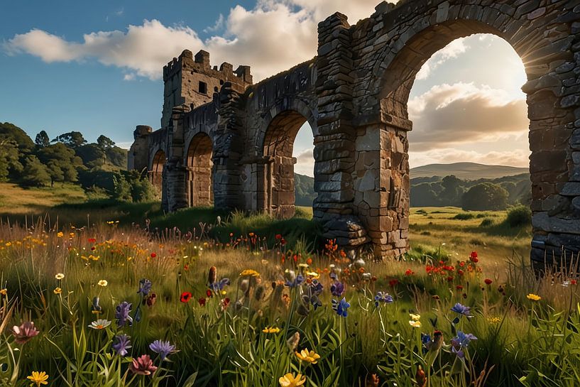 Bestelle dieses Landschafts-Wandbild Schottische Highlands mit Wildblumen und Ruine. von Brian Morgan als Reproduktion auf Leinwand, Alu-Dibond, als Poster, Fototapete oder Acrylglasbild.
