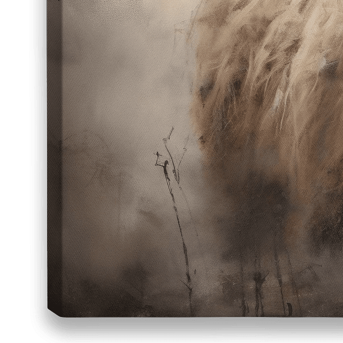 Ein dramatisches Ölporträt eines schottischen Highlanders mit seinen charakteristischen Hörnern und seinem wolligen Fell. Der Hintergrund des Porträts ist in warmen Grautönen mit leichtem Nebel gemalt, wodurch der Highlander voll zur Geltung kommt und dem Porträt ein Gefühl von Tiefe verliehen wird.