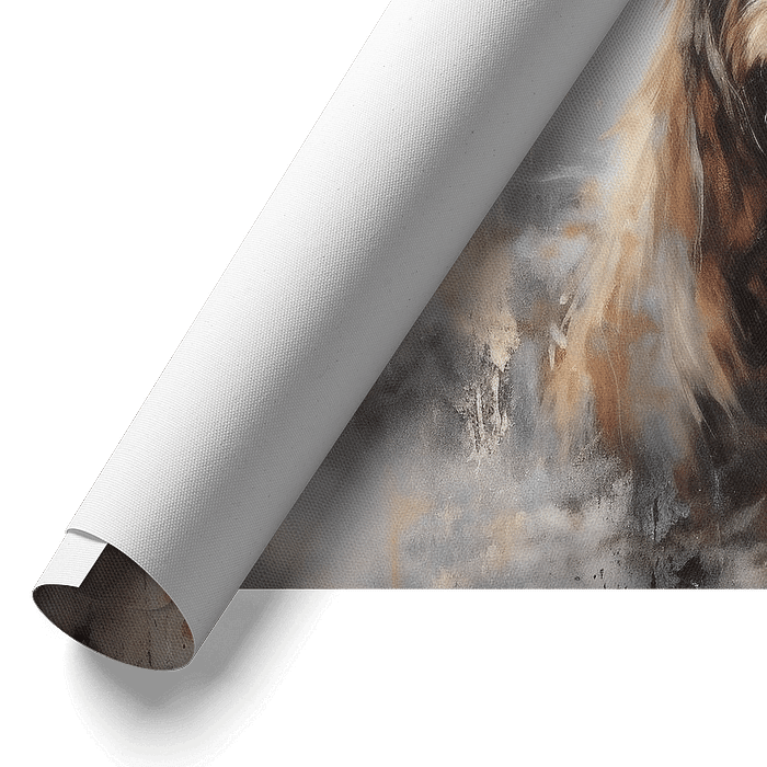 Die warmen Grautöne tragen zu einem rustikalen und natürlichen Aussehen bei. Der Highlander ist in einer ruhigen und gelassenen Pose dargestellt, die dem Porträt einen Hauch von Frieden und Ruhe verleiht.