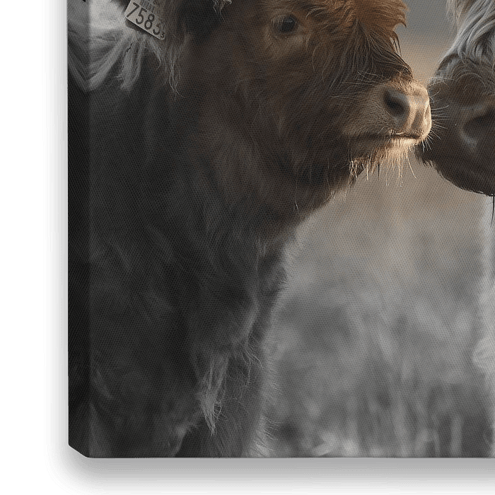 Bestelle dieses Landschafts-Wandbild Schottischer Highlander Kalb mit Mutter zweifarbig von Sascha van Dam als Reproduktion auf Leinwand, Alu-Dibond, als Poster, Fototapete oder Acrylglasbild.