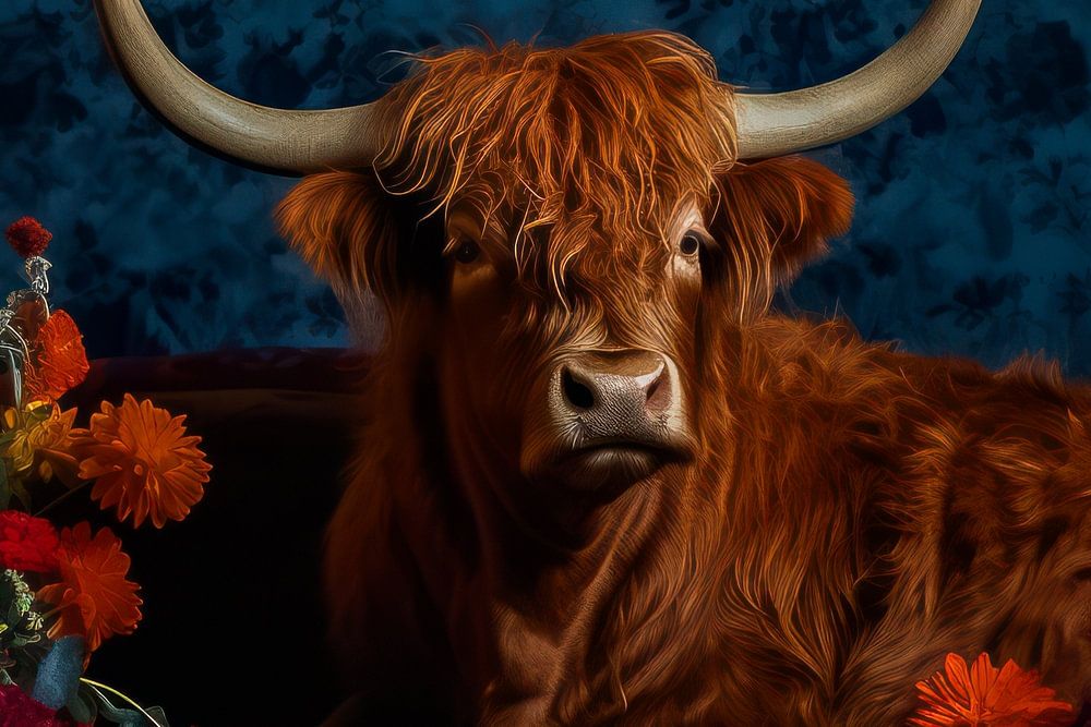 Stillleben eines schottischen Highlanders zwischen roten Blumen und blauem Hintergrund.