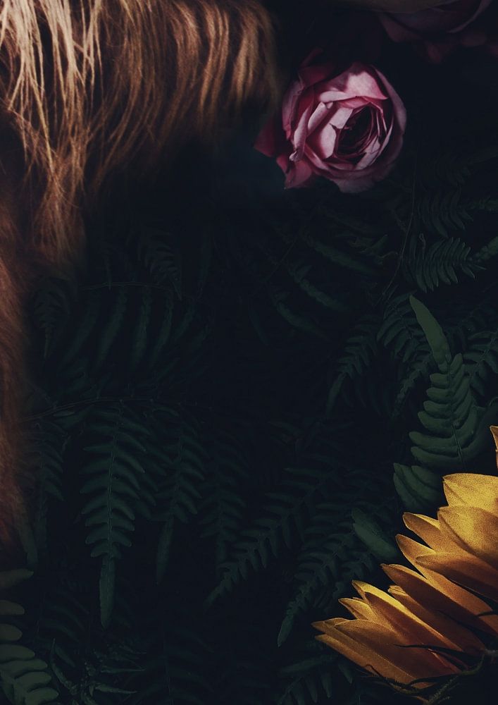 Schottischer Highlander mit Blumen, Diese schöne Arbeit hat schöne helle und weiche Farben und einen sehr schönen Kontrast. Dies ist ein echter Blickfang für Ihr Zuhause.