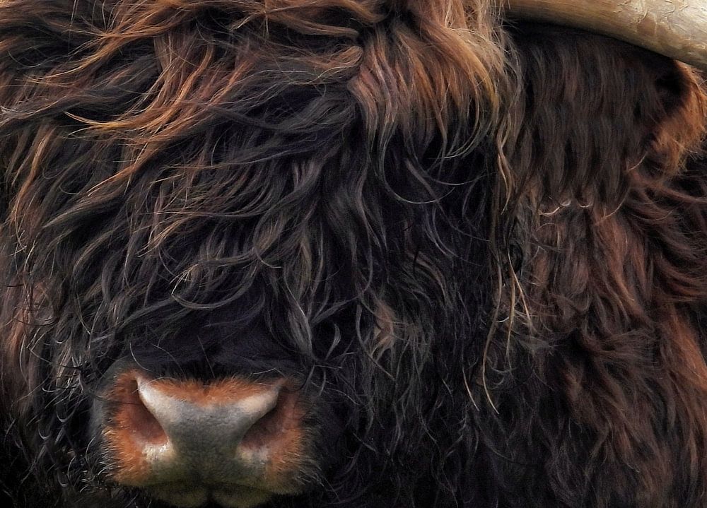 Dieser robuste schottische Highlander hebt sich gut vom schwarzen Hintergrund ab. Ich finde es extrem cool, dass seine Hörner nach unten zeigen, wodurch dieses Porträt nach der Drittel-Regel schön ausgewogen ist.