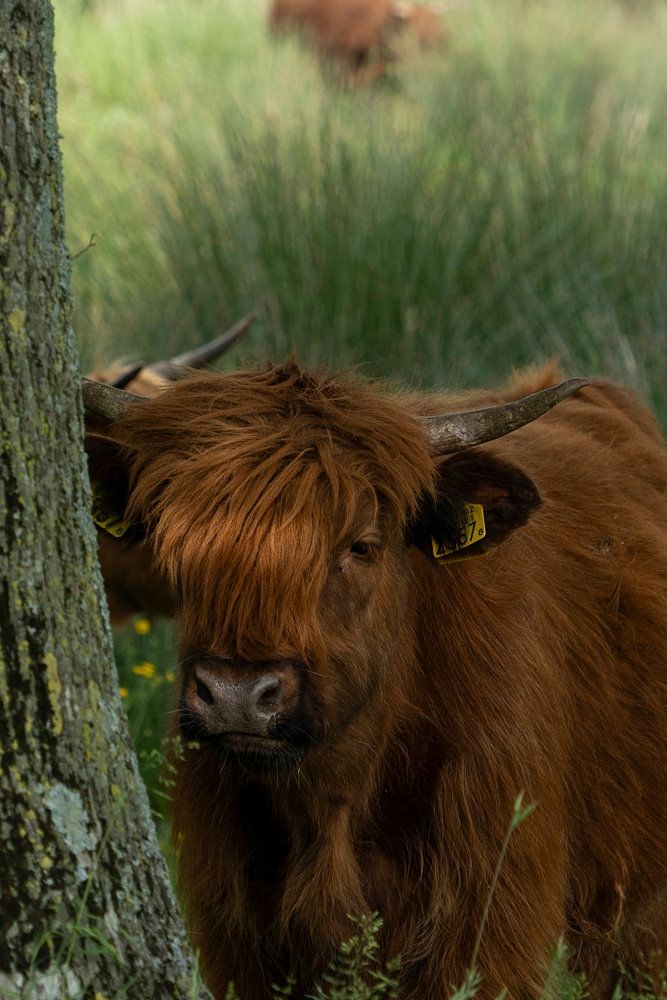 Junge schottische Hochlandhunde in grün. Schottische Hochländer sind ruhige und nicht-aggressive Tiere, sie sehen knuddelig aus, sind es aber definitiv nicht. Kommen Sie ihnen in freier Wildbahn nicht zu nahe, aber machen Sie sich ein schönes Bild an der Wand!