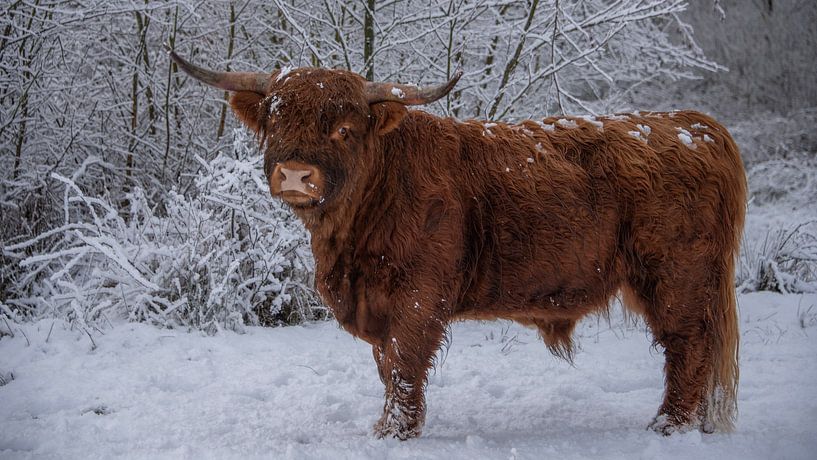 Ein schottischer Hochländer, ein großer, kräftiger Bulle, steht in einer verschneiten Landschaft. Er bleibt schön für mich stehen, damit ich ein schönes Foto von ihm machen kann, als würde er model stehen. Es hat gerade geschneit, die Schneeflocken liegen noch auf seinem Kopf und seinem Körper. Es ist ein ruhiges Tier mit einem dicken…