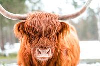 Porträt eines schottischen Hochlandrindes im Schnee an einem frühen Frühlingstag in einem Wald. Die schottischen Hochlandrinder werden beim Naturschutz in der Veluwe eingesetzt, um sicherzustellen, dass die Heideflächen nicht zu dicht wachsen.