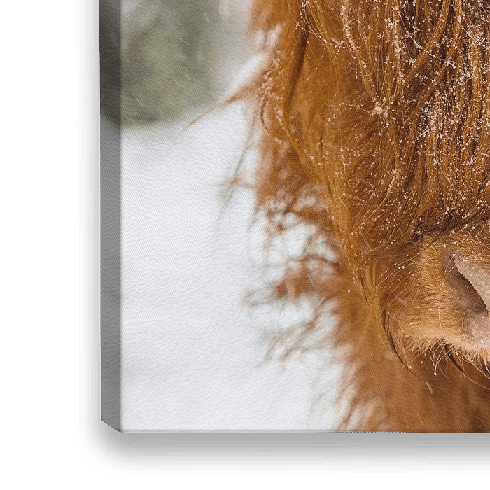 Porträt eines schottischen Hochlandrindes im Schnee im Winter. Die schottischen Highlander werden im Naturschutz der Veluwe eingesetzt, um sicherzustellen, dass die Heideflächen nicht zu dicht wachsen.