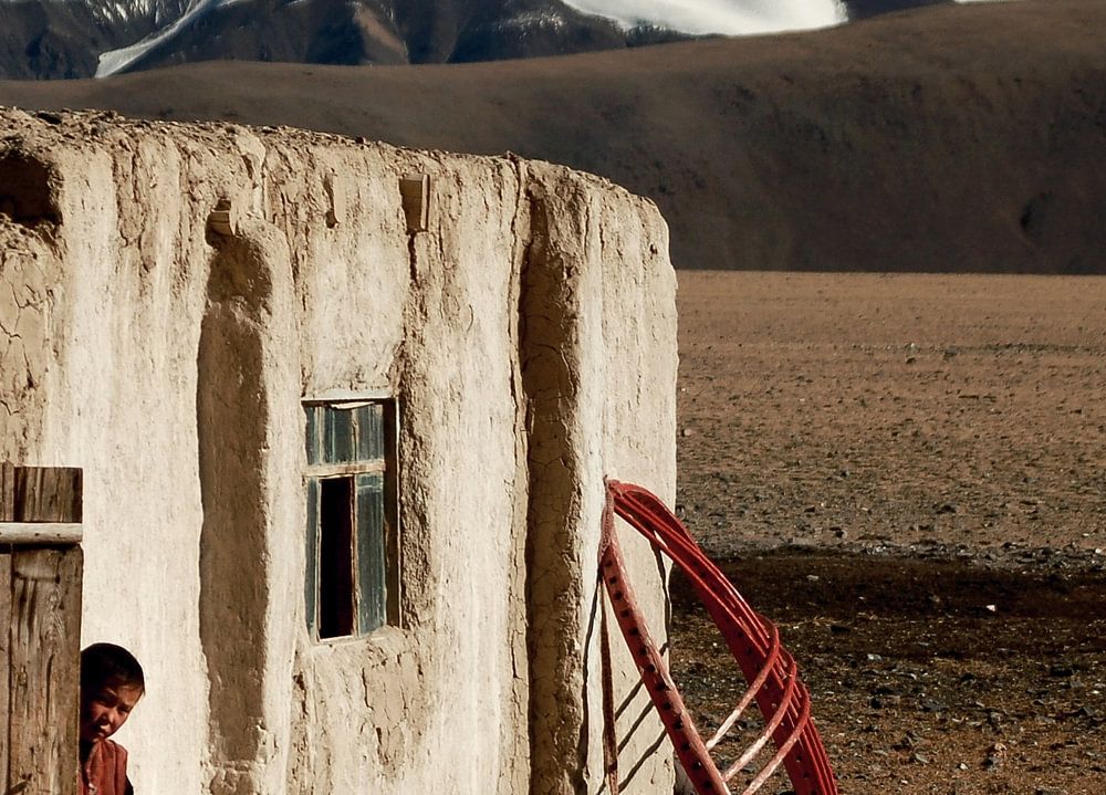 Winterhaus in der westlichen Mongolei, mit dem Berg Tsambagarav im Hintergrund