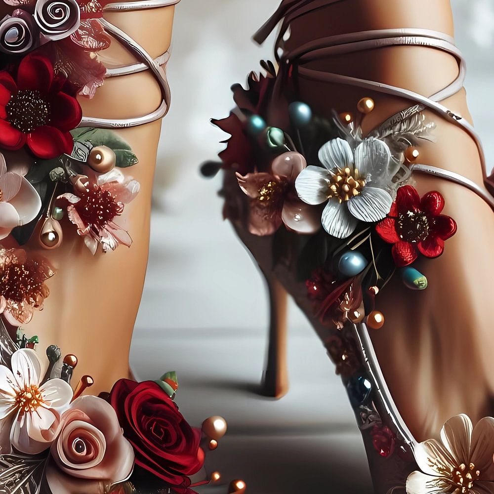 Elegante Schuhe mit hohen Absätzen sind mit aufwendigen Blumendekorationen in satten Farben verziert, die für einen skurrilen und femininen Look sorgen. Die Fesselriemchen verleihen einen Hauch von Raffinesse und vervollständigen das bezaubernde Design.