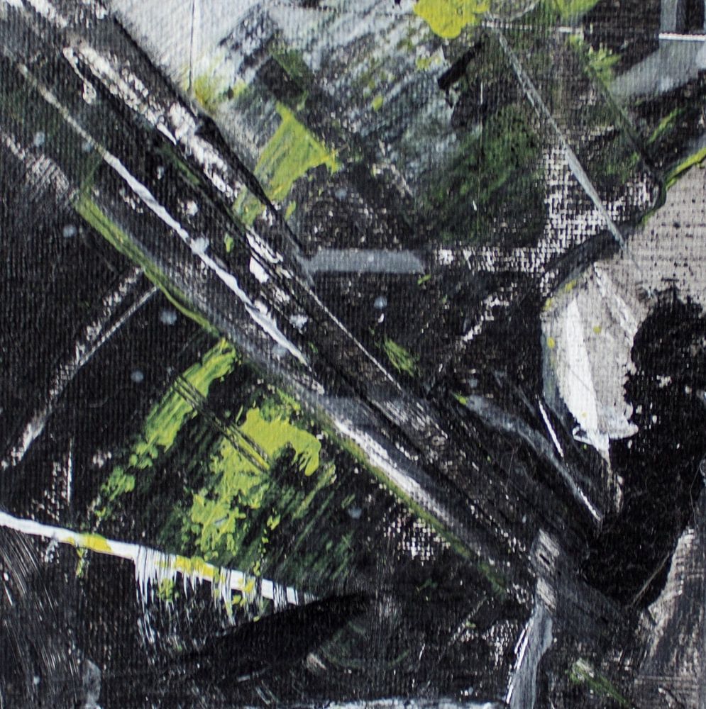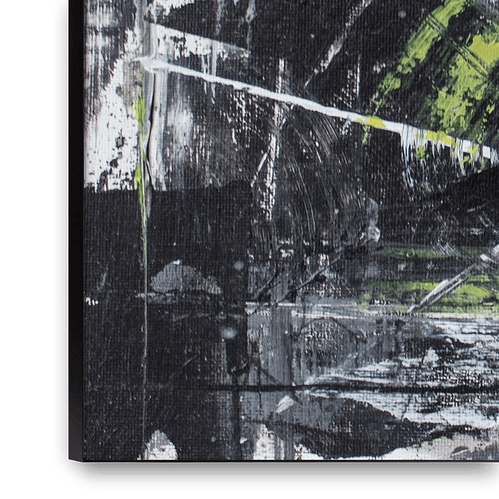 Dieses Gemälde ist abstrakt, vermittelt aber eine ganz bestimmte Stimmung. Es ist rau, spontan und ein wenig rebellisch. Die Grundfarben sind Schwarz, Weiß und Grautöne, doch diese leuchtend gelben Streifen ziehen den Blick sofort auf sich. Die Farbe ist grob aufgetragen, und genau das macht den Charakter dieses Werks aus. Man sieht…
