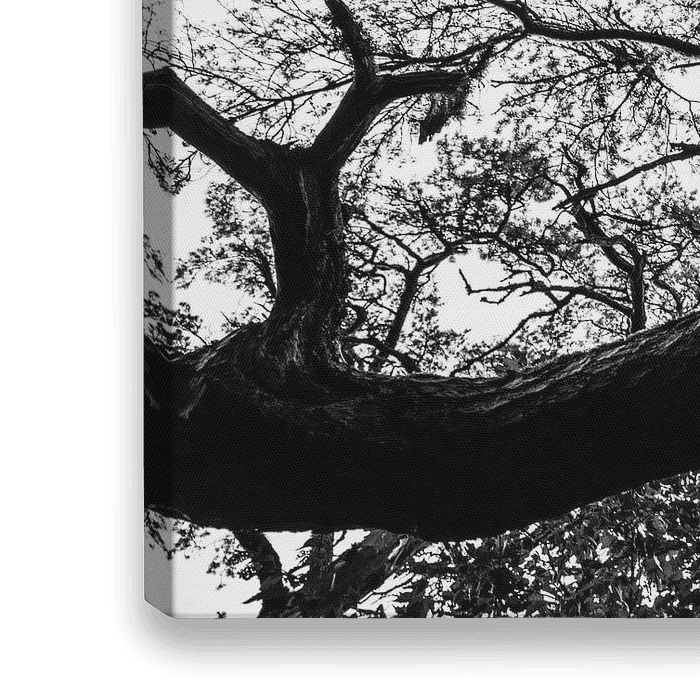 Schwarz-Weiß-Bild eines rustikalen Baumes. Starker Kontrast zu den Ästen. Großer, alter Baum. Das Foto wurde aus einer niedrigen, froschartigen Perspektive aufgenommen.