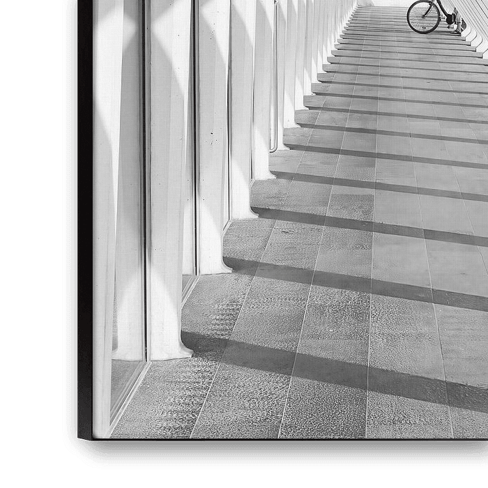 Bei der Aufnahme fielen mir besonders die geometrischen Formen des Bildes auf, die fast eine mathematische Perfektion ausstrahlen. Und in der Mitte des Bildes erschien auch ein Fahrrad, bereit, in den Fahrradschuppen zu fahren.