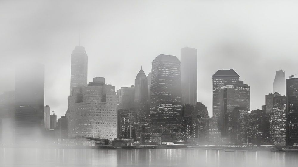 Schwarz-Weiß-Foto einer Stadt Silhouette im Nebel mit Wolkenkratzern New York City