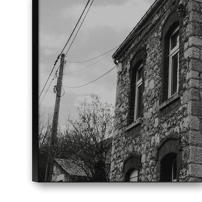 Dieses Schwarz-Weiß-Foto habe ich während meines Urlaubs in den belgischen Ardennen in der Stadt Marchin in der wallonischen Region zwischen Modave und Huy aufgenommen. Mir gefiel das Bild mit den typischen Ziegelsteinen, Strommasten und Kabeln.