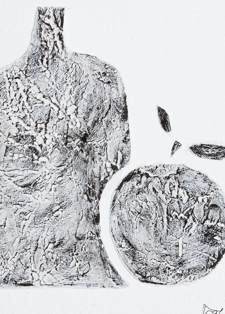 "Die schwarz-weiße Komposition" ist Teil einer Serie mit dem Titel "Stillleben". Das Gemälde der französischen Künstlerin Beatrice Chauville wurde mit gemischten Medien auf handgeschöpftem Naturpapier geschaffen. Es handelt sich um ein Stillleben aus verschiedenen Flaschen und Gläsern, die auf einen schönen natürlichen Papierhintergrund gedruckt sind.